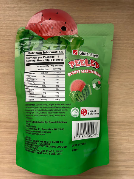 Peelable gummies, lolly skin and a soft gummy centre. Watermelon Flavoured
